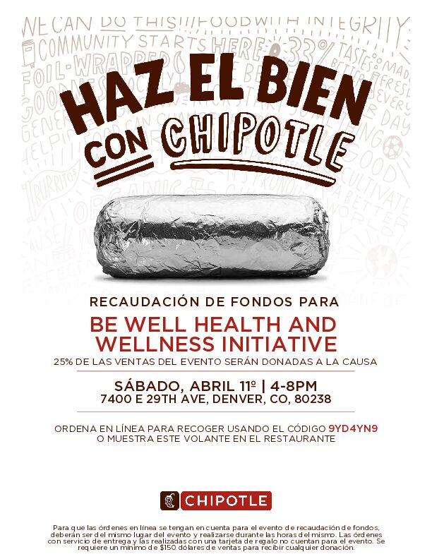 Join us for a meaningful evening on Saturday, April 11th, from 4 PM to 8 PM at Chipotle, located at 7400 E 29th Ave. Enjoy delicious food while helping us make a difference—25% of all sales during this event will be donated to be well. Your support matters!